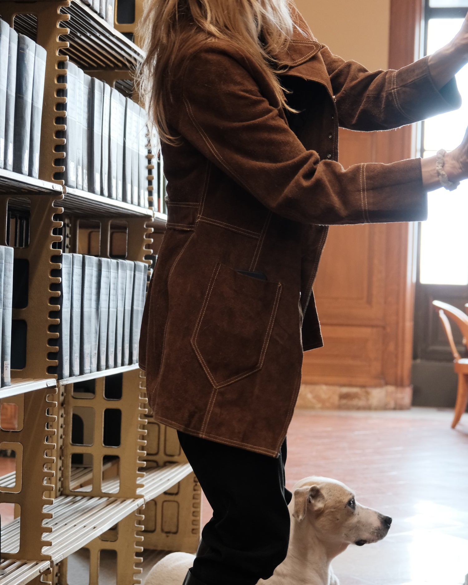 A suede vintage jacket is a classic outerwear piece made from soft, brushed leather in a warm, reddish-brown (cognac) hue. Known for its retro appeal, it often features details like wide lapels, button or snap closures, and a tailored fit. The vintage style may show natural wear or patina, adding to its character and timeless charm. Perfect for a casual yet elevated look