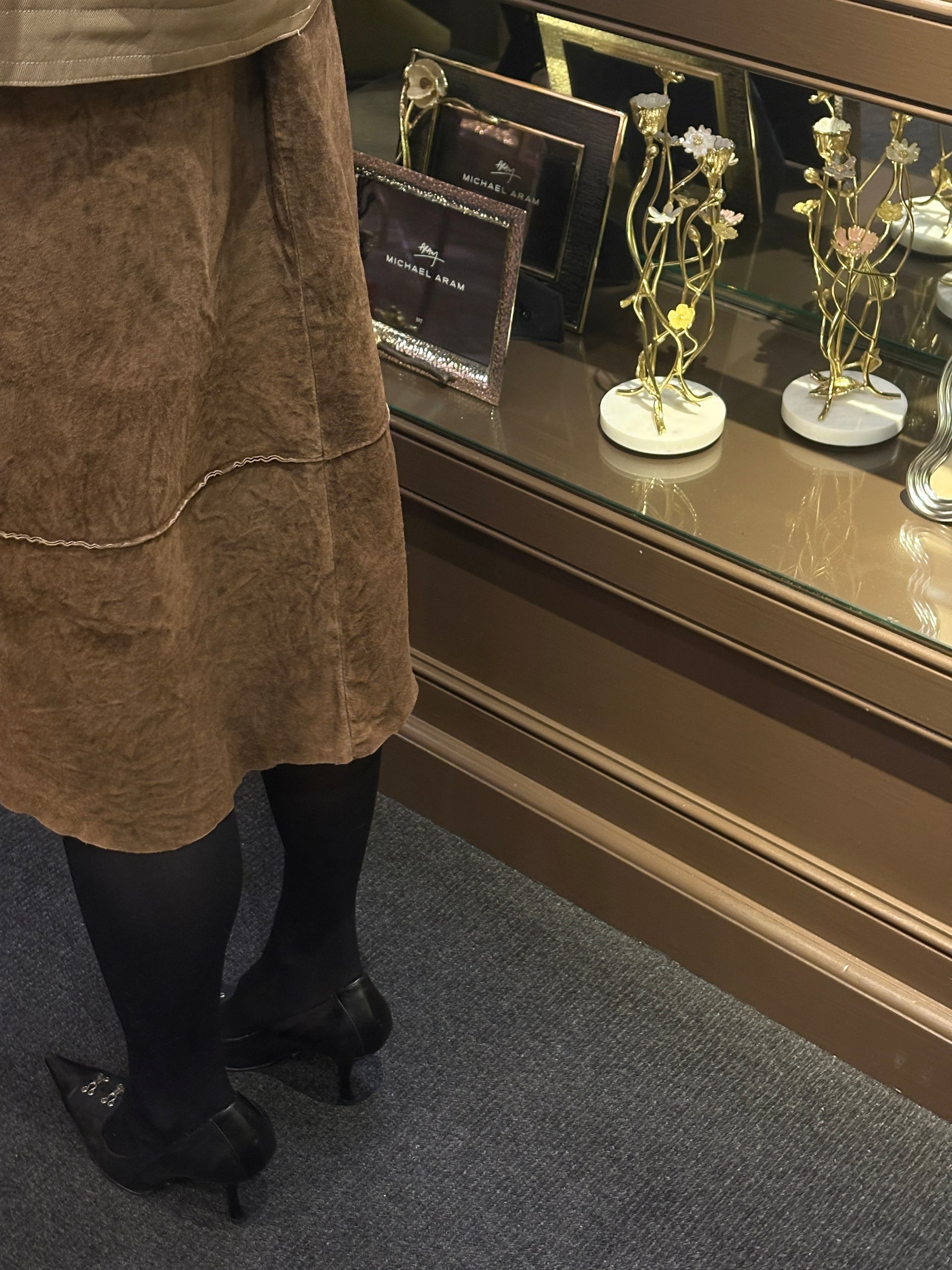 A beautifully structured suede leather pencil skirt that brings warmth, texture, and quiet sophistication to any wardrobe. Crafted in a rich brown hue, its soft, velvety finish adds depth while the knee-length cut creates an elegant, elongated silhouette.