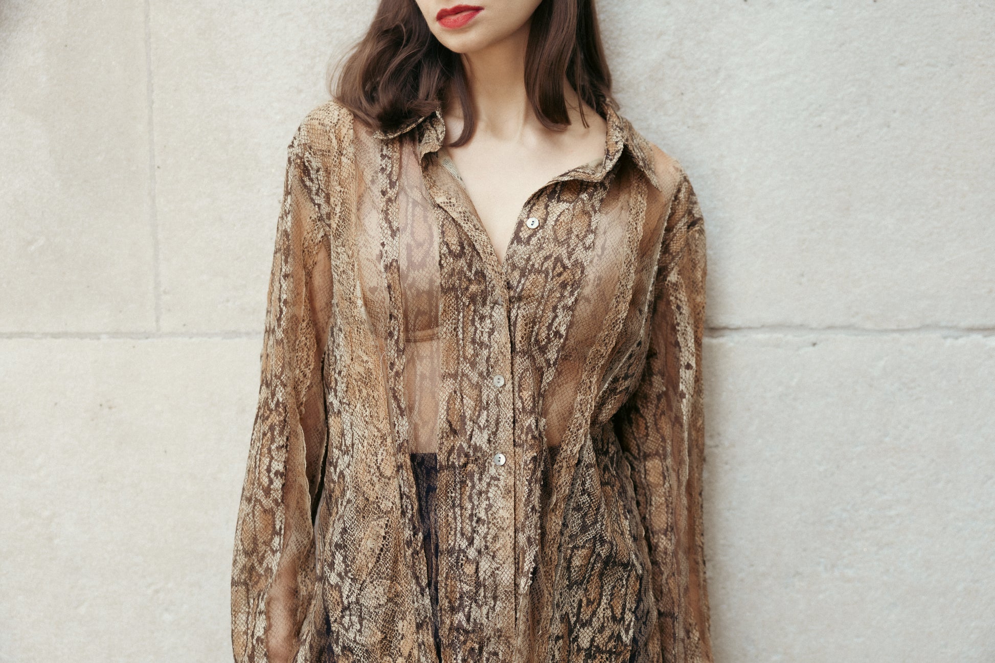 A refined take on animal print, this sheer tiger-pattern blouse brings an elevated edge to any wardrobe. Crafted from a lightweight, translucent fabric, it drapes effortlessly while offering subtle texture and movement. The earthy tones create a warm, natural palette that pairs seamlessly with tailored trousers or structured denim. Finished with a classic collar and soft silhouette, it’s a statement piece that feels both powerful and elegant—perfect for day-to-night styling.