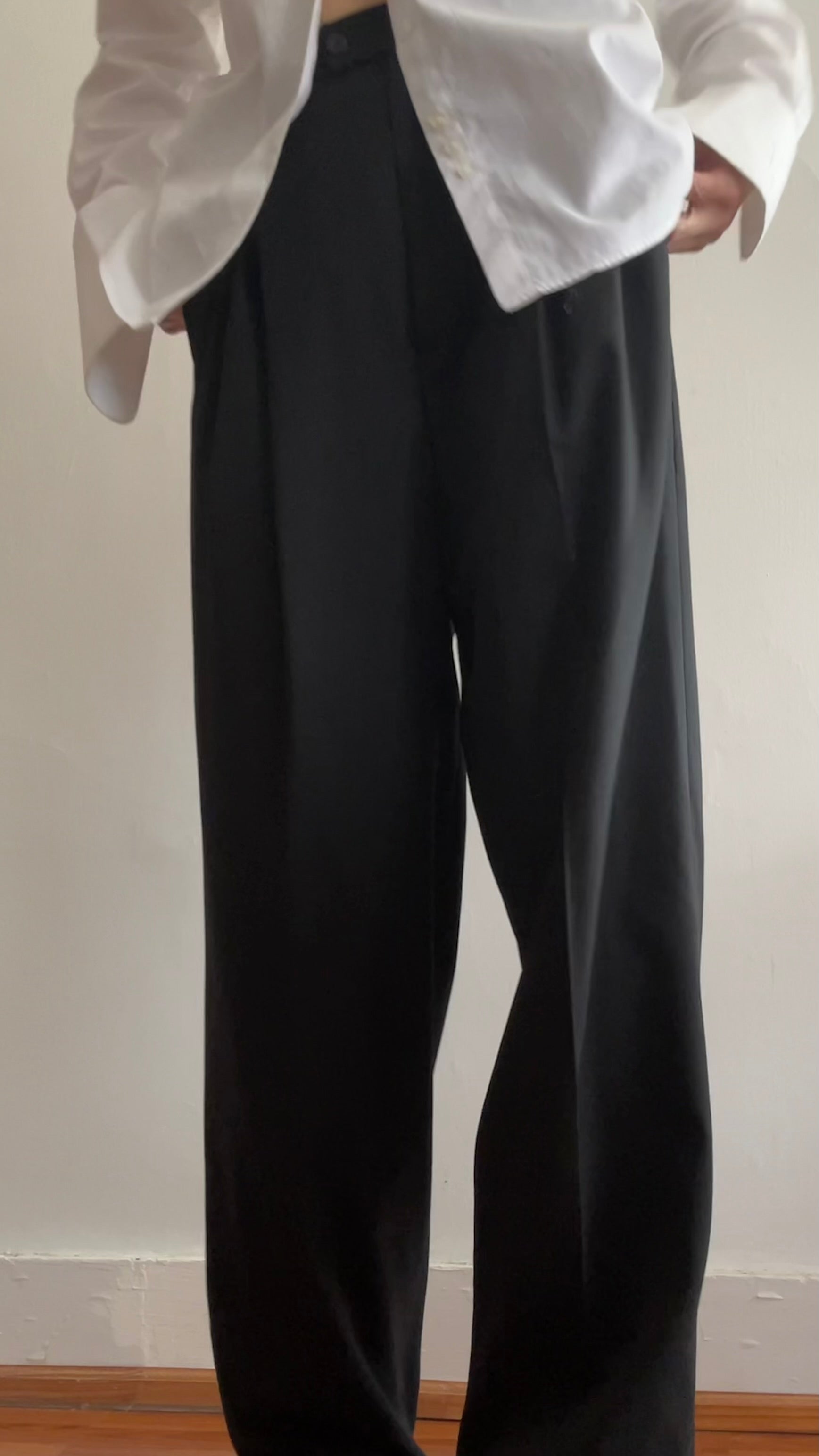 These black wool pants are expertly crafted in France, showcasing a high-waisted design that elongates the legs and offers a flattering silhouette. The pleated front adds subtle texture, while the cuffed ankles provide a touch of sophistication. Made from 100% wool, these pants are both comfortable and luxurious.
