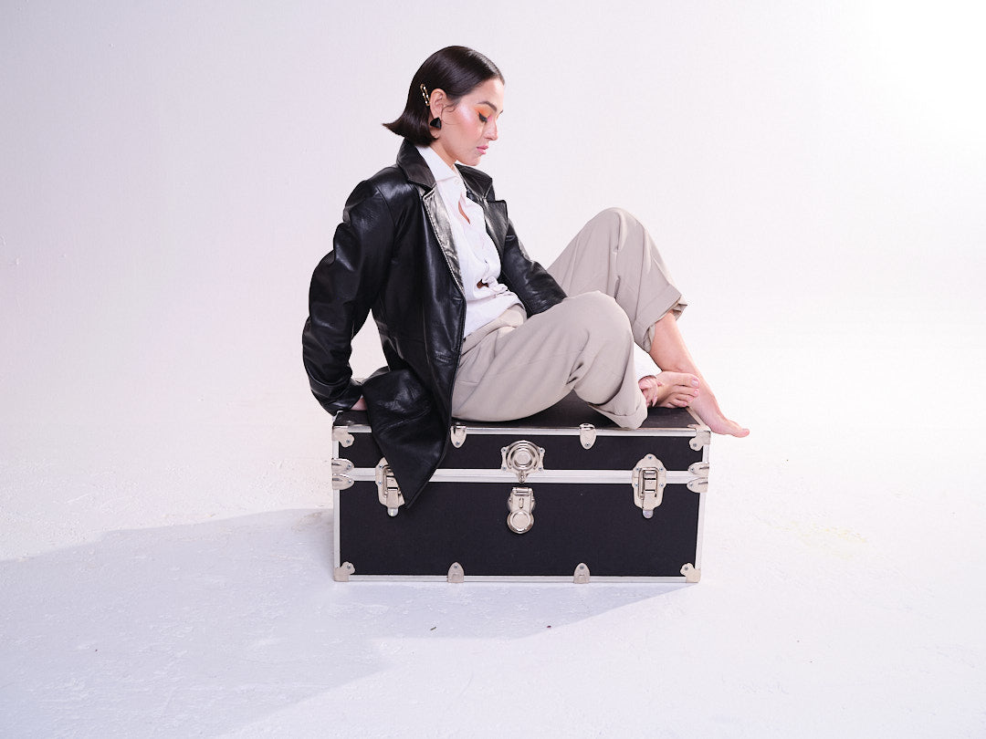 This vintage black leather jacket brings a refined, lived-in texture that contrasts effortlessly with a crisp white button-down. Paired with fluid, sand-toned tailored trousers, the silhouette feels relaxed yet intentional—an understated balance of sharp tailoring and supple leather. The overall look is clean, modern, and timeless, letting each material speak through shape and movement.